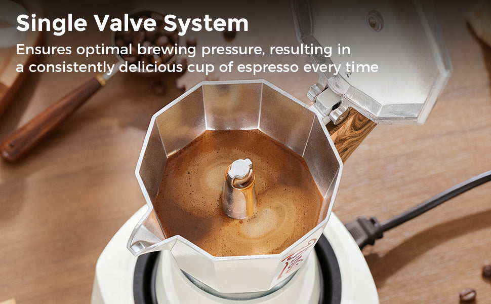 It uses a double-valve / dual-valve design in many models: one valve for safety/pressure control, another for flavour extraction. This design supports a richer extraction, more crema and fuller flavour compared to a traditional moka pot.